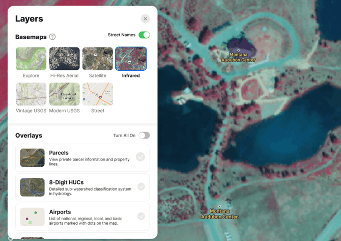 Best for detailed mapping in heavily vegetated areas where features like fence lines and trails are obscured; analyzing a property's forest or crop patterns; crop stress tracking; monitoring fertilizer applications; and crop yield estimation.