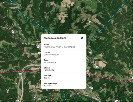 Tip: Click on a transmission line to see a pop-up with information on the name, owner, type, service status, voltage and voltage range of each transmission line feature.
